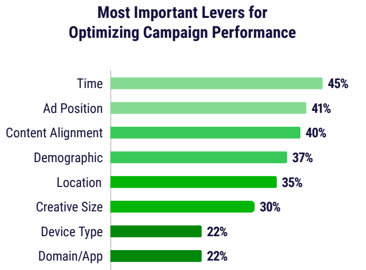Time was considered the most important “lever” for optimizing campaign performance in programmatic ad buys, as two-thirds (66%) of those surveyed spend at least 8 hours a week manually optimizing their digital campaign, with the average taking up 10 hours (or 26%) of their time.