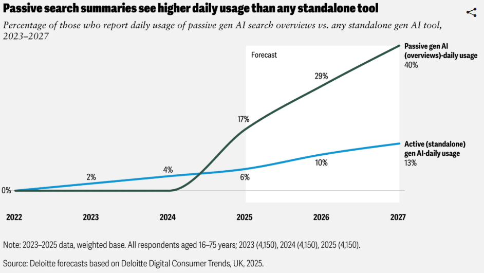 Perhaps nowhere is that passive usage more easily illustrated than within search, which Deloitte forecasts will see a 300% more common daily usage than any other standalone AI tool.