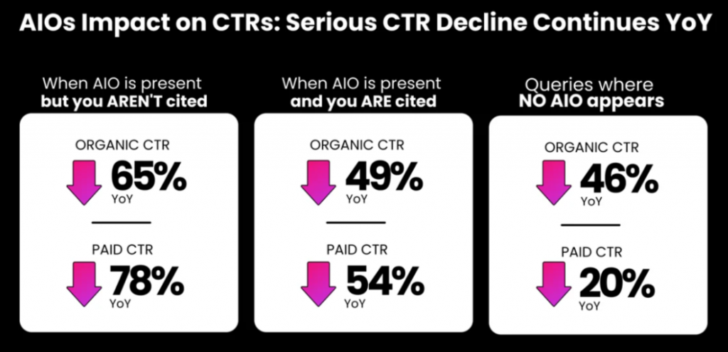 “In January we hypothesized that AI Overviews will significantly affect CTRs for both organic and paid search and that the impact will vary based on (1) the query type and (2) AI Overview citations,” writes Seer Interactive’s Tracy McDonald of research that ultimately found organic CTR falling from 1.41.% to 0.64% for search queries with AI Overviews. “This was absolutely confirmed. And that impact is even more severe than we predicted.”