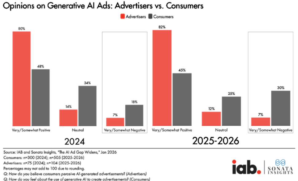 “Advertiser perceptions of AI don’t align with consumer attitudes,” write the study’s authors. “82% of ad executives believe Gen Z/Millennial consumers feel very or somewhat positive about AI-generated ads, nearly double the 45% of consumers who actually feel that way. This gap has widened from 32 points in 2024 to 37 points in 2026.”