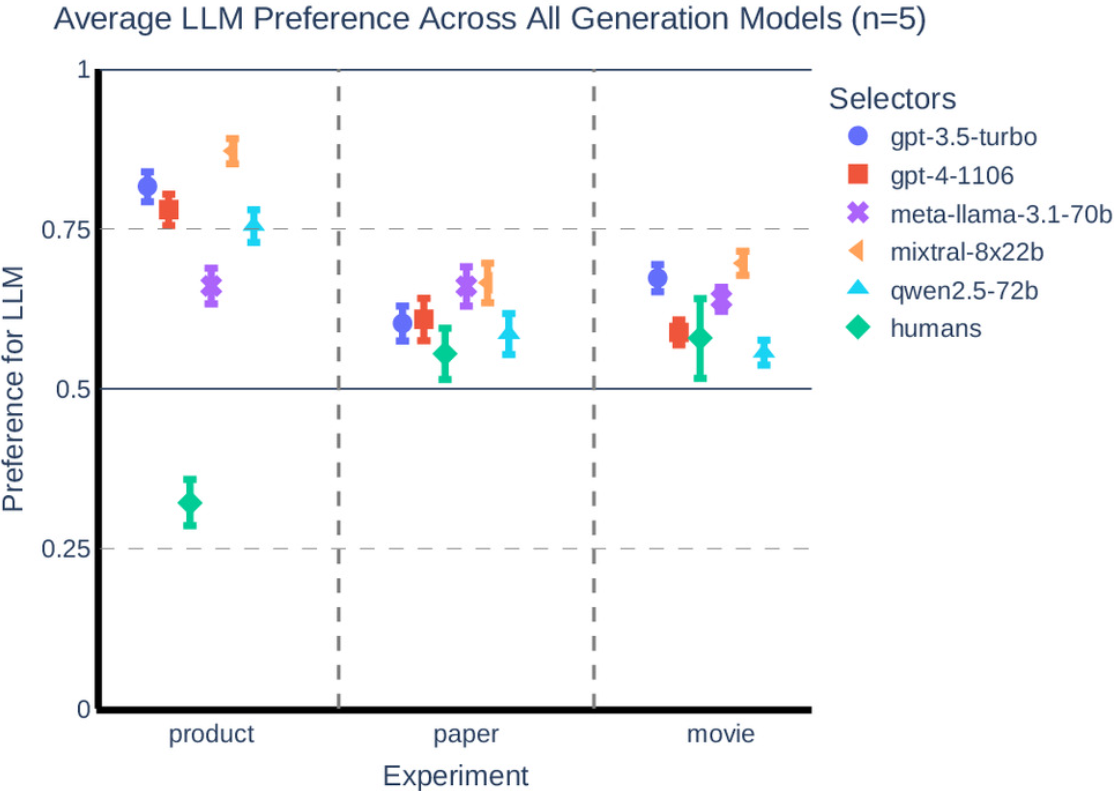 “Except for a slight reversal in the movie domain with GPT-3.5, the results show that LLMs prefer LLM-pitched items at a higher rate than human evaluators,” the study says. “This discrepancy supports our design-driven hypothesis that the strong preference observed in LLMs toward LLM communications is driven by model-specific evaluation criteria rather than by quality-signal differences between human- and LLM-generated texts.”