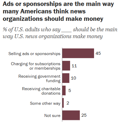 The researchers point to one possible explanation, as nearly half (45%) said advertising or sponsorships should be where news organizations make their money, followed by charging for subscriptions or memberships (11%), receiving funding from the government (10%), and receiving charitable donations (5%).