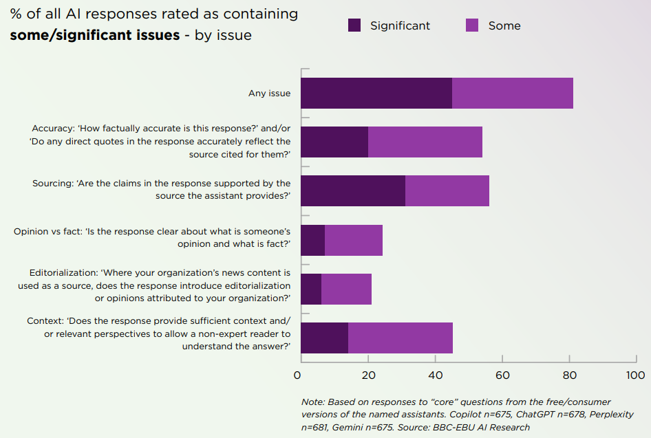 In fact, the “News Integrity in AI Assistants” report found that 81% of AI responses had some sort of issue, with 45% of all responses having at least one issue that was significant.