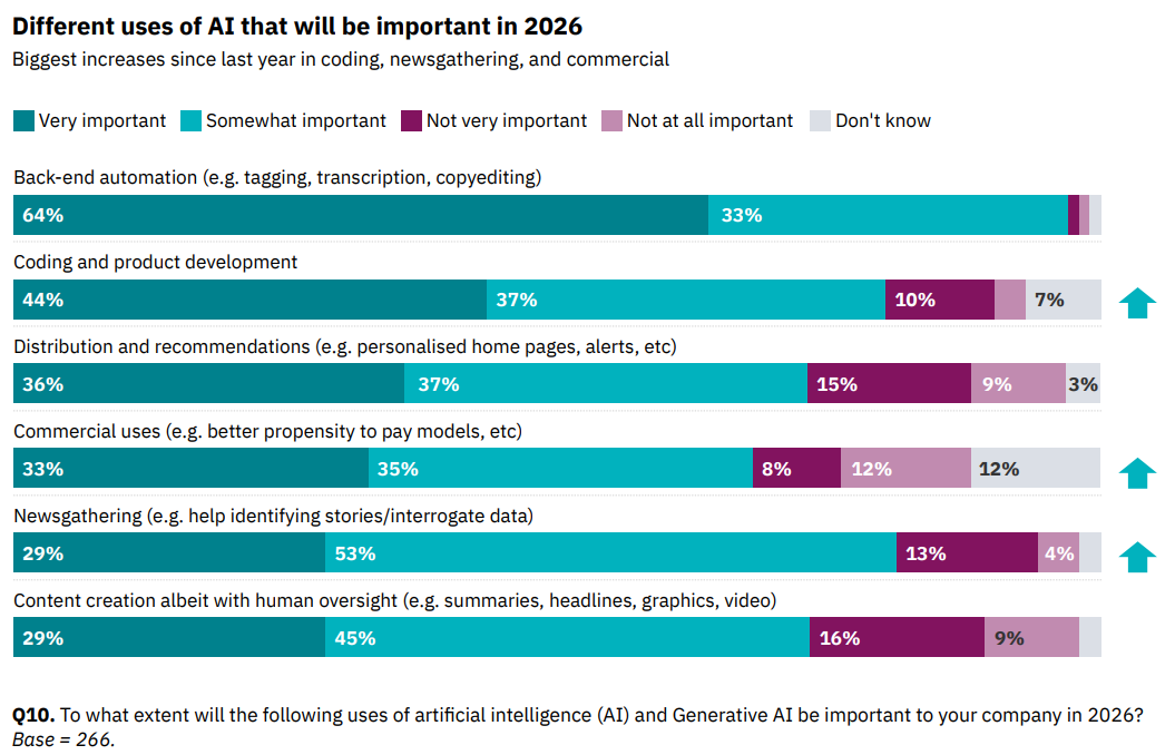 Publishers told Reuters they were more likely to focus on original investigations, more contextual analysis, community-building efforts, and human stories in light of AI’s emergence. Looking ahead, back-end automation tasks like tagging and transcribing were seen as the most essential AI use — 64% said it was very important — followed by coding and product development (44%) and “distribution and recommendations” (36%).