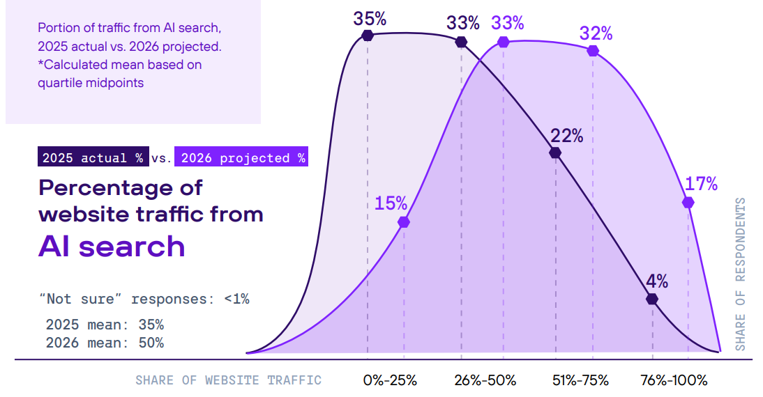 “This shift is dramatic,” says the AI Search and Discovery: Enterprise Benchmark Report. “Only 26% received over half their traffic from AI search in 2025, but by the end of 2026, 49% expect to hit that threshold. That’s nearly doubling in one year.”