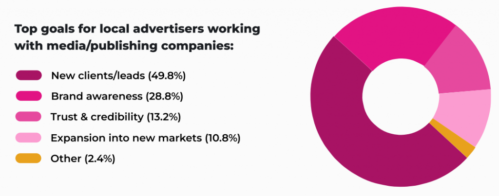 Almost half (49.8%) of local advertisers said their top goal for working with a media or publishing partner was acquiring new clients and leads. (Brand awareness was second for 28.8%, and trust and credibility third for 13.2%.)